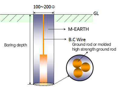 The earth's inherent resistance (Ω·m) varies depending on the depth, density, and moisture content of the soil. Before grounding, analyze the earth's inherent resistance or soil to select the optimal depth. Then, use a crawadill or similar equipment to bore (about 5-20 meters deep), connect the ground copper rod to the spiral wire, insert it, and put the mixed M-EARTH into the space.
