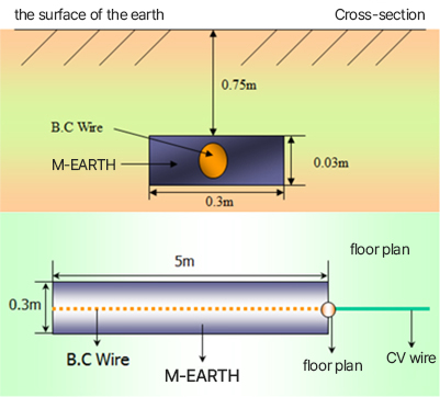 For grounding construction using a bare copper wire (50mm² or more) method, a pit with a width of 50cm and a depth of 75cm or more is created as shown in the figure. The bare copper wire is positioned in the center of the pit, then M-EARTH is applied at a thickness of 5cm to sufficiently cover the bare copper wire, and the pit is backfilled with soil.